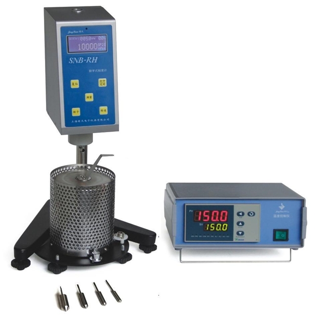产品介绍 精天 SNB-RH 高温旋转粘度计是专为测量高温下为固态、经加热成液态的物质,如沥青、热熔胶和聚乙烯蜡等而设计的粘度测量仪器。该仪器具有易于单机操作的便捷性,能够将测量数据直接显示在液晶屏上,无需二次计算。还可以选择配备《数据采集分析和绘图软件》来实现数据采集和分析,全程监控粘度-温度曲线,确保测量的准确性。采用高细分步进电机,可确保转速的准确性和稳定性。液晶屏带蓝色背光功能,能够直接显示粘度、转速、百分计扭矩、转子编号以及当前转速下所选转子可测的最大粘度值和温度值,而DV-2系列还支持显示剪切率和剪切应力。当粘度值超出测量范围时,仪器会发出报警声提示。此外,该仪器的计量性能达到国外同类产品水平,高温炉采用内嵌式整体加热,受热均匀,热惯性小,使其成为一款高精度、高可靠性的粘度测量工具,特别适用于高温环境下的粘度测量需求。 主要测量常温下为固态,高温加热后成液态的物质,如沥青、热熔胶、聚乙烯蜡等。 可单机使用,测量数据直接显示在液晶屏上,无需二次计算;也可选配《数据采集分析和绘图软件》实现数据采集和数据分析,全程监控粘度-温度曲线。 采用高细分步进电机,转速准确、平稳。 LCD液晶带蓝色背光功能,直接显示粘度、转速、百分计扭矩、转子编号以及所选用转子在当前转速下可测的最大粘度值、温度值。DV-2系列还可显示剪切率、剪切应力。粘度值显示连续变化,超出测量范围有报警声提示。 该仪器计量性能通过计算机修正准确性达到国外同类型产品水平。 高温炉采用内嵌式整体加热,受热均匀,热惯性小。